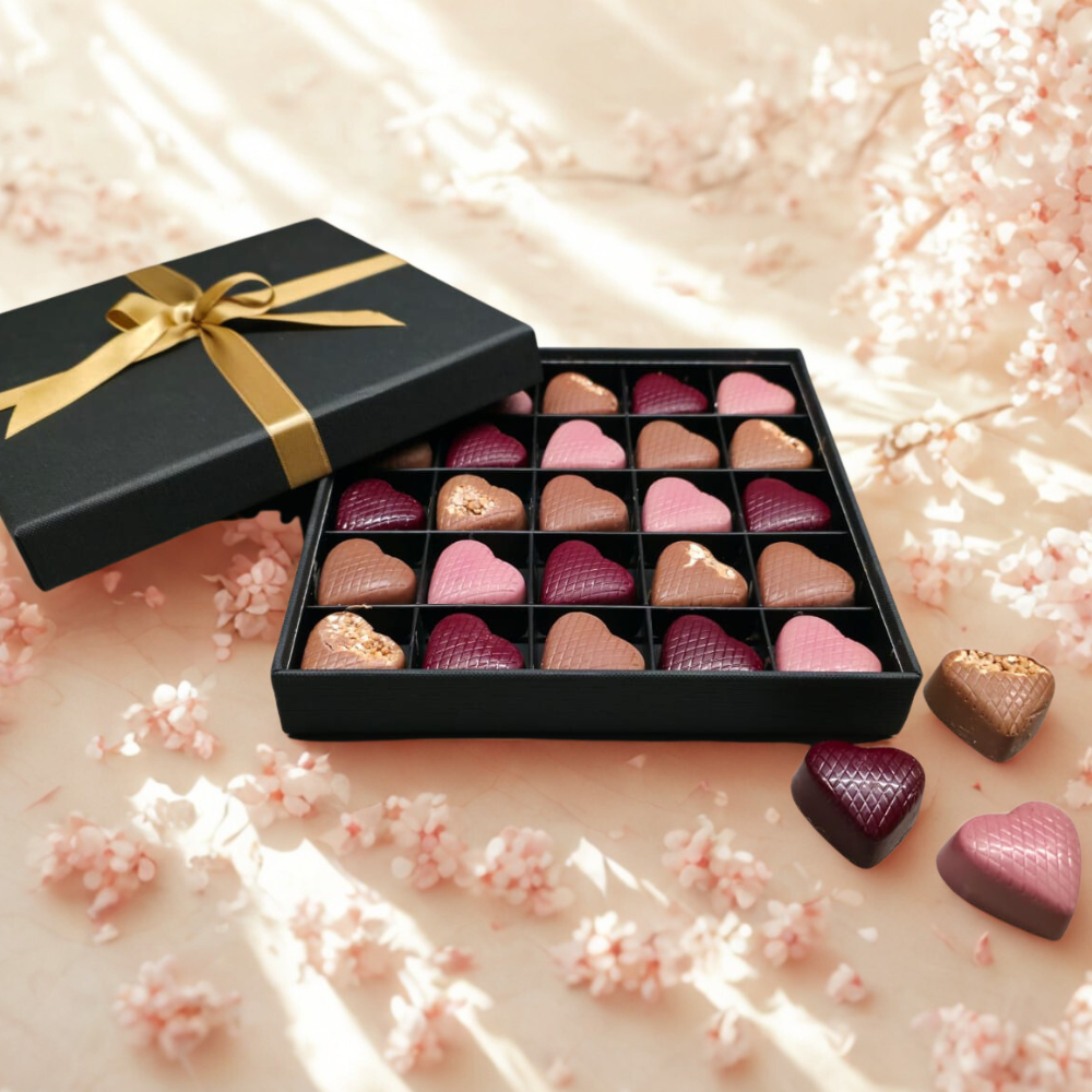Soms wil je gewoon even écht uitpakken. In dit royale doosje vind je 25 handgemaakte hartjesbonbons van het bekende topmerk Visser Chocolade. Geen kleine attentie, maar een complete proeverij om samen te delen – of om iemand uitgebreid mee te verrassen. 🍫