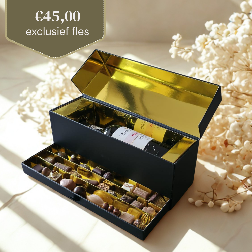 In de geïntegreerde lade ontdek je een royale selectie van onze iconische Original bonbons van Visser chocolade. Je maakt het geschenk compleet en persoonlijk door er een fles kwaliteitsdrank naar keuze aan toe te voegen, geselecteerd in samenwerking met de specialisten van Vinyo in Someren: