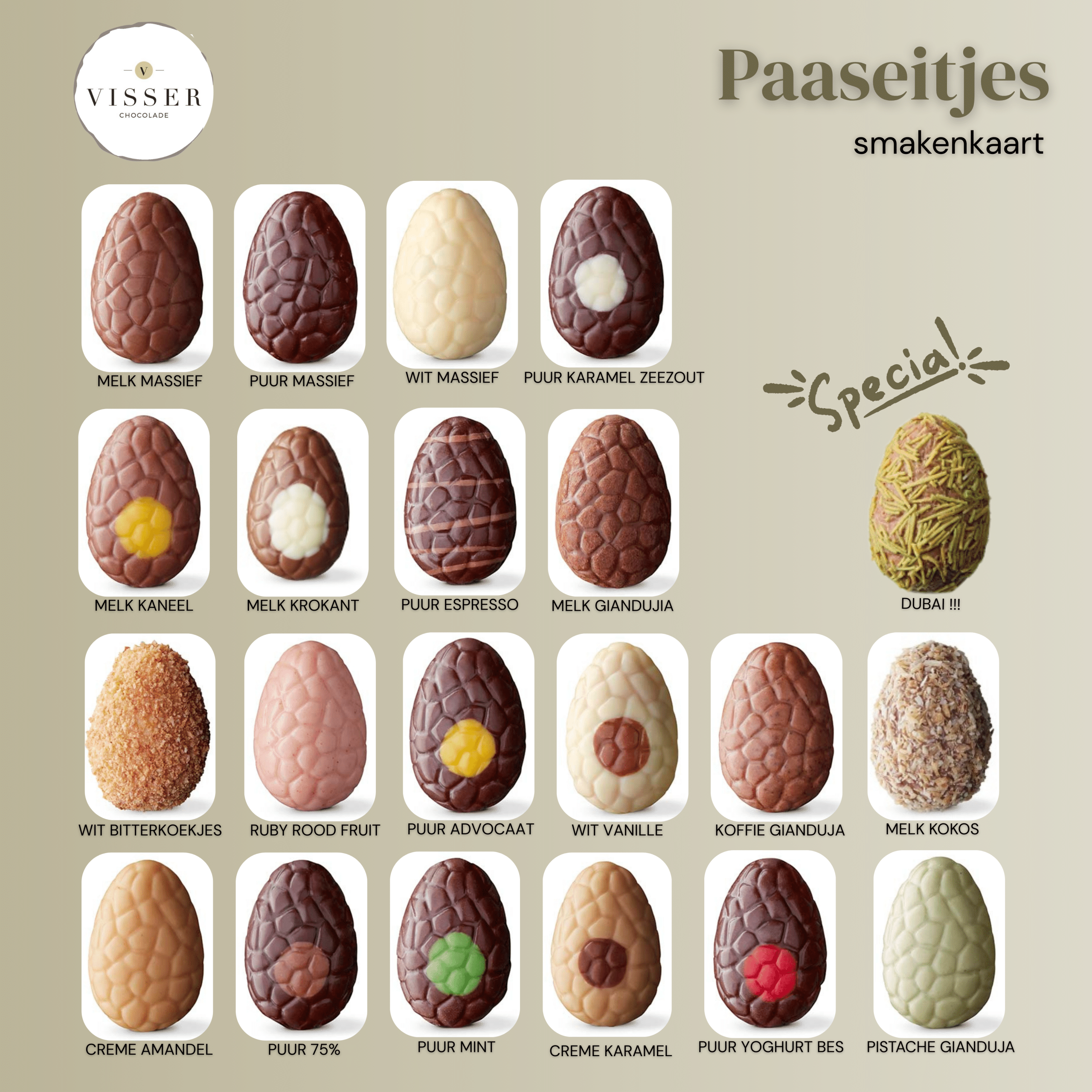 Hier is een smaakvol overzicht van de 21 verschillende paaseitjes die wij voor je hebben geselecteerd uit de collectie van topchocolatier Visser Chocolade. Een mix van tijdloze klassiekers en gedurfde nieuwe smaken die van elk paasgeschenk een ontdekkingstocht maken! 🐣✨